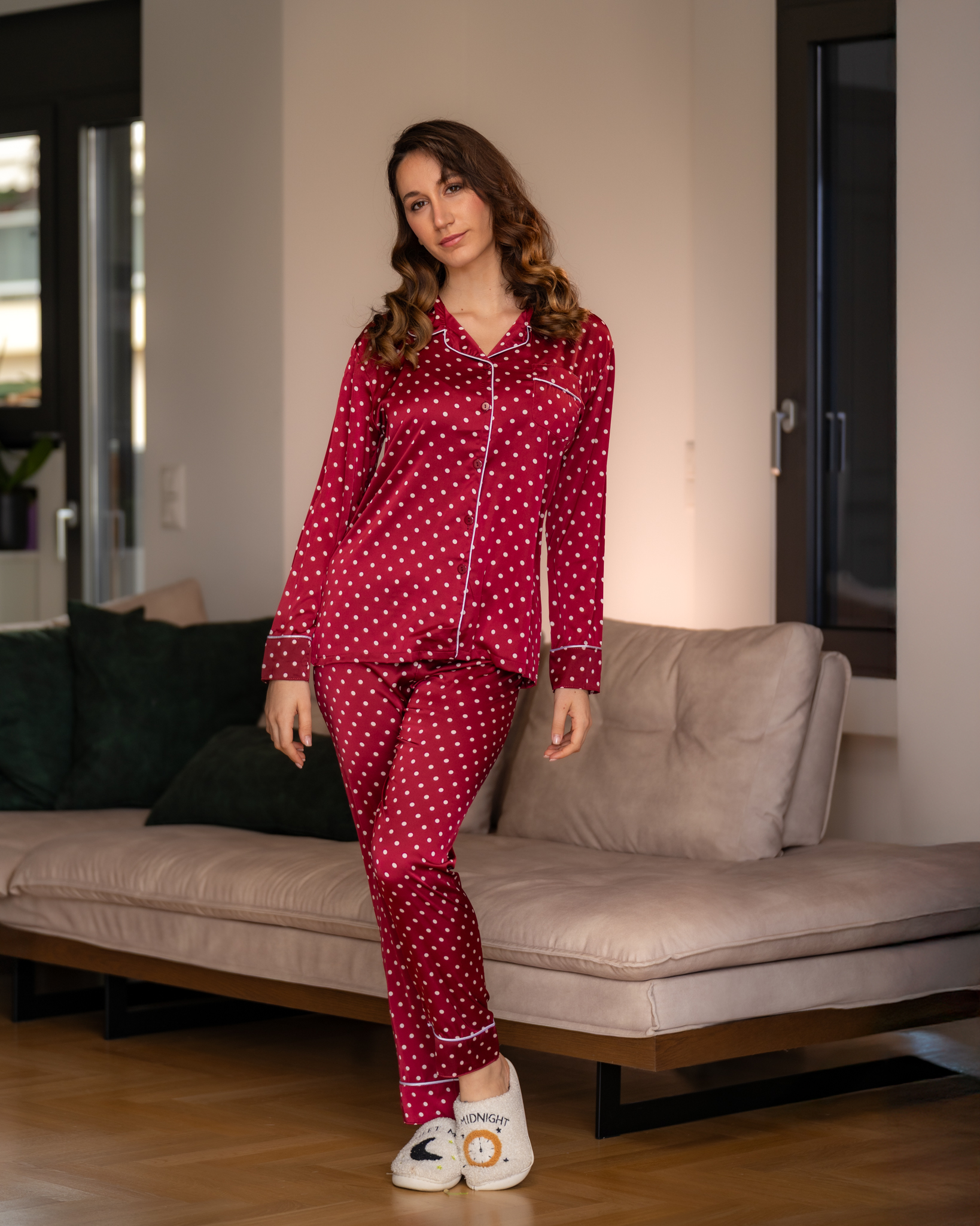 Πιτζάμα με σατινέ μαλακή υφή, σετ παντελόνι με λάστιχο και πάνω μέρος με κουμπάκια.