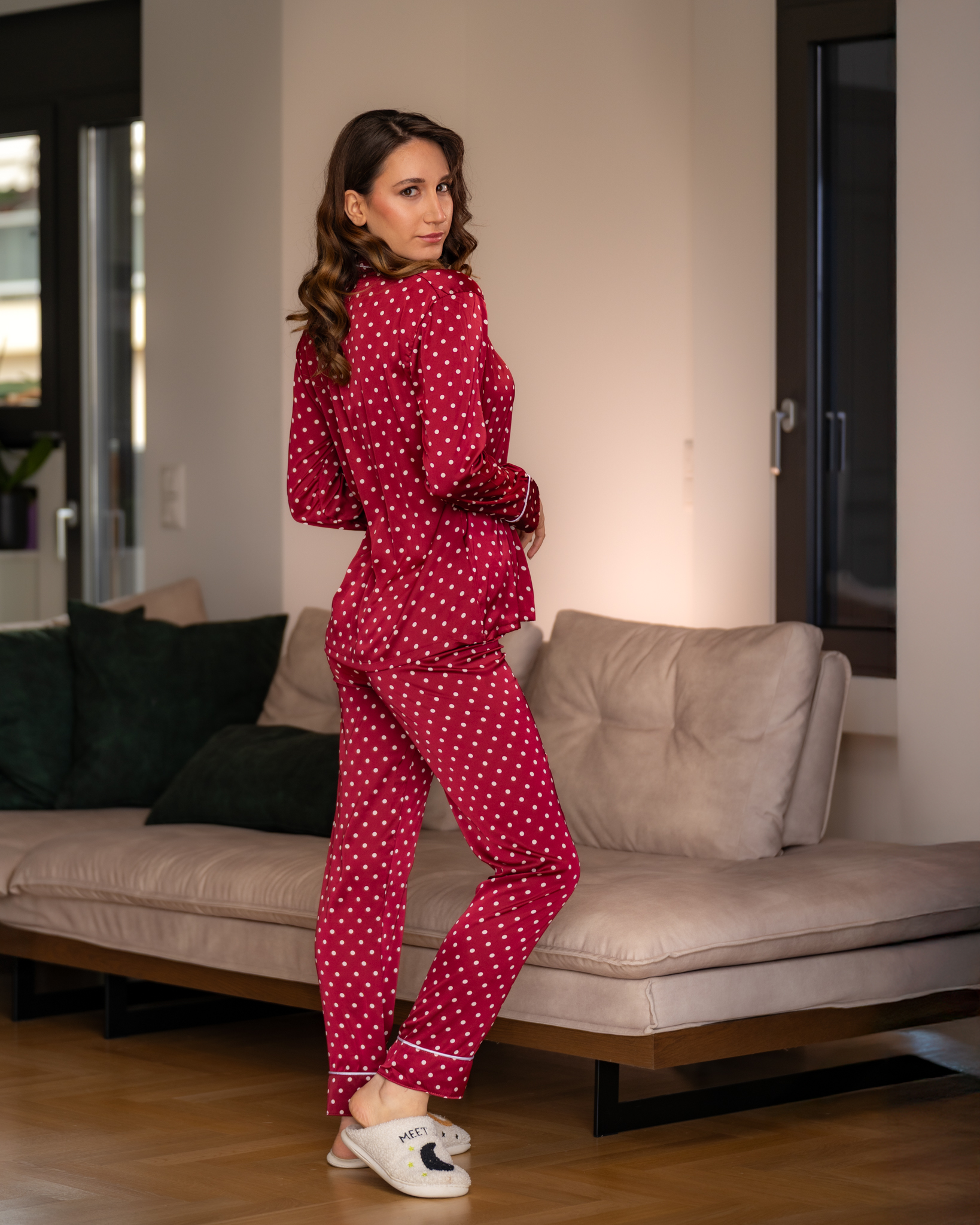 Πιτζάμα σετ σατινέ με καρδιές και λευκό ρέλι